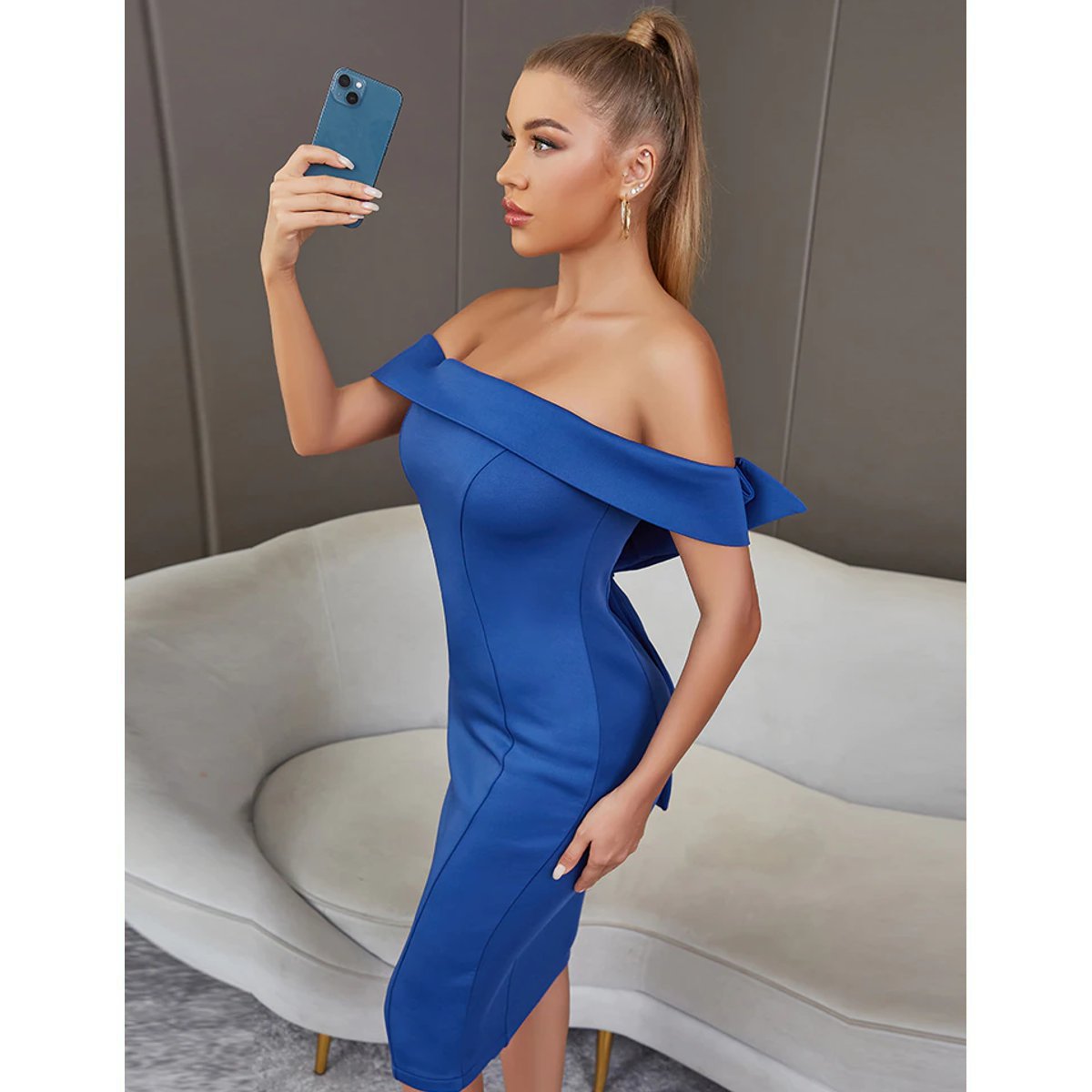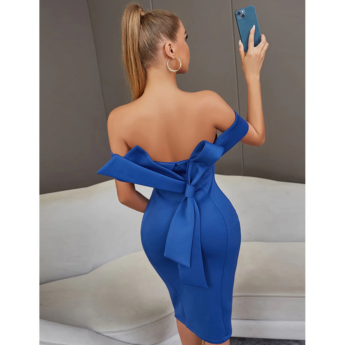 Impactante vestido azul, con hombros descubiertos, con un hermoso detalle tipo lazo en la parte posterior, ajustado y estilizado, altamente elegante, fabricado con poliéster y spandex, ideal para una fiesta o evento especial.