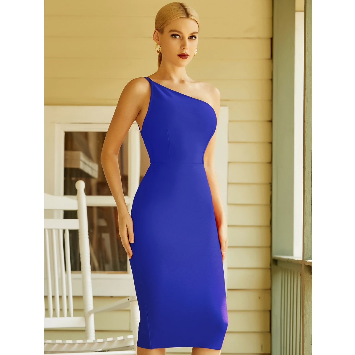 Hermoso vestido tipo Bandage azul, muy sexy sin mangas, con espalda descubierta, ajustado a media pierna, hecho íntegramente de poliéster y spandex, ideal para una fiesta o evento especial.