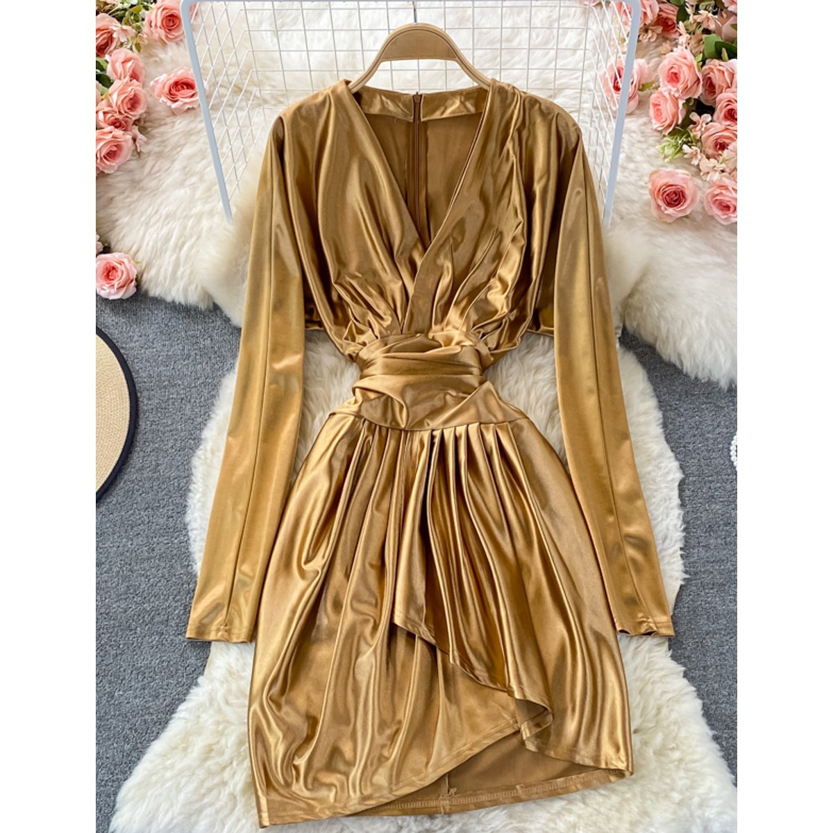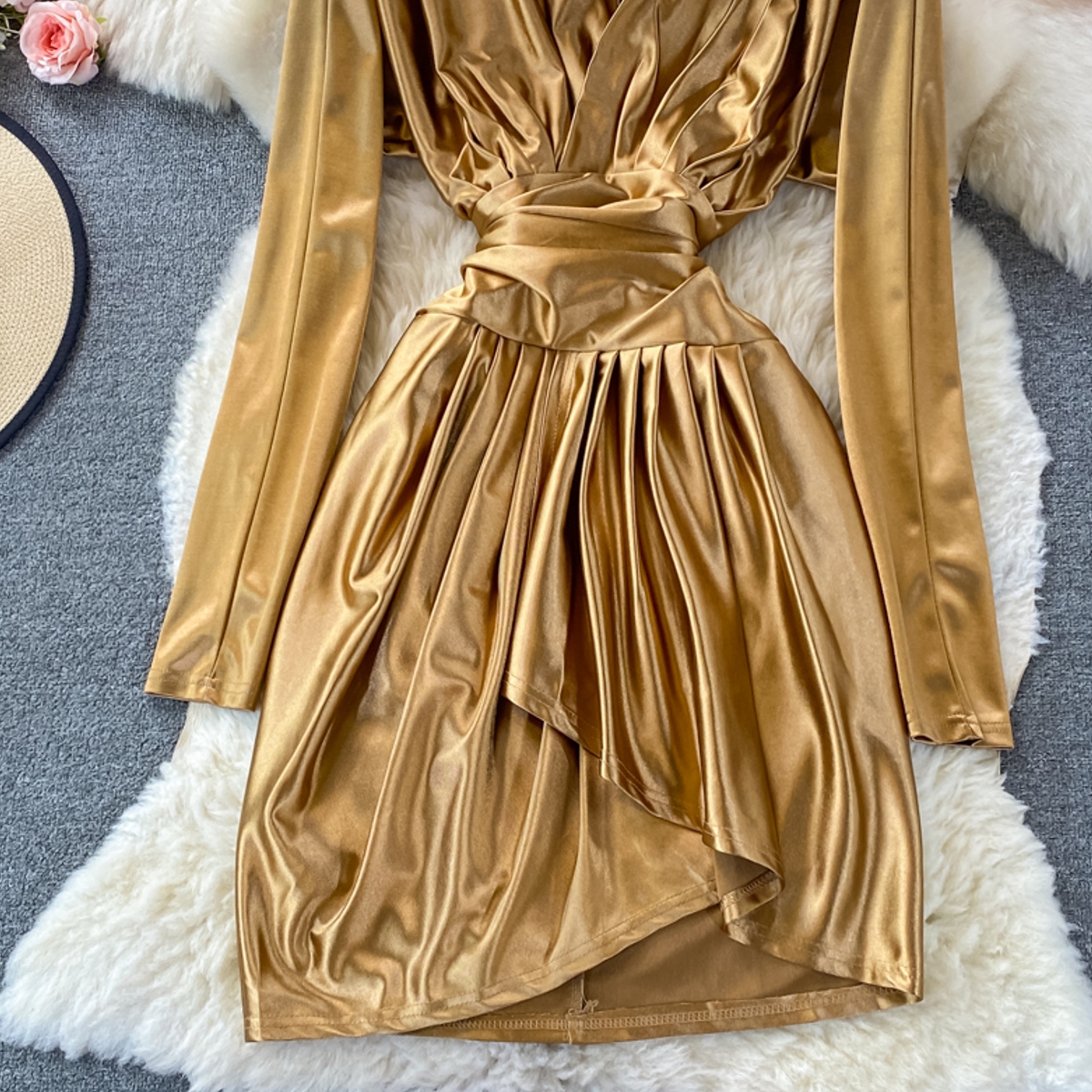 Maravilloso vestido drapeado, estilo vintage de satén dorado, muy elegante con cuello en V, manga larga, cintura alta y parte inferior asimétrico, ideal para fiestas y eventos especiales, muy elegante.