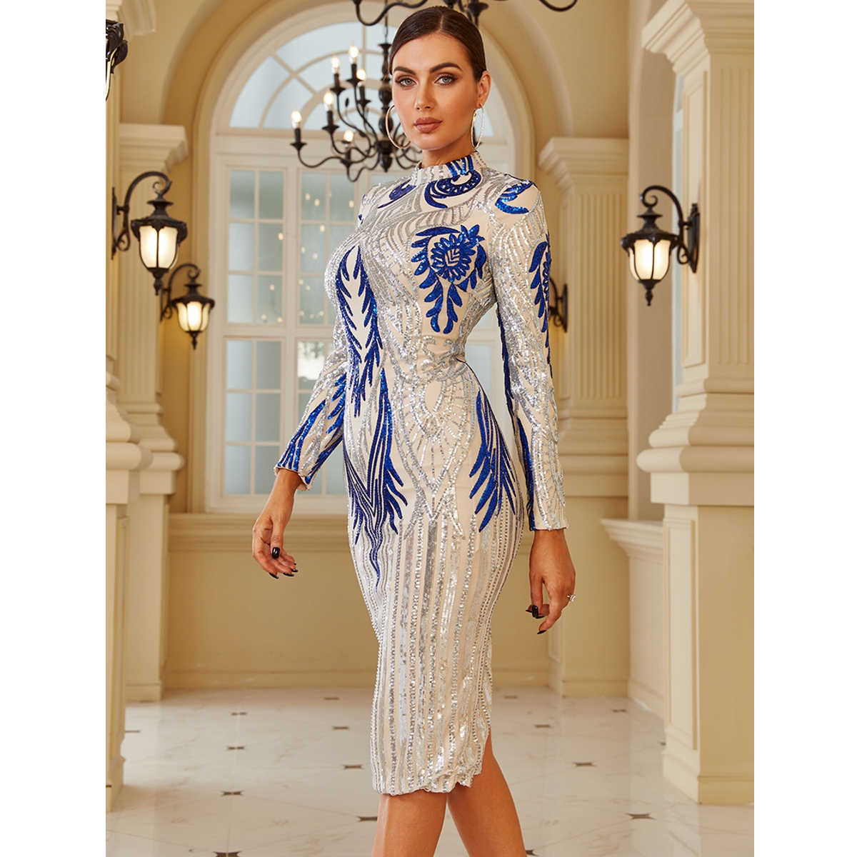 Hermoso y encantador vestido largo de fiesta con lentejuelas plateadas y azules, muy sexy y elegante, con cuello redondo y manga larga.