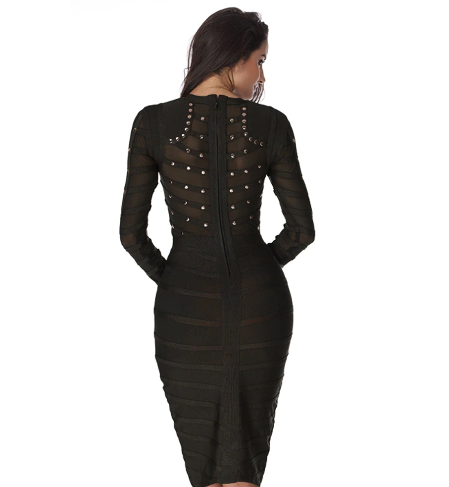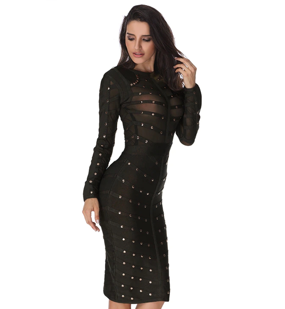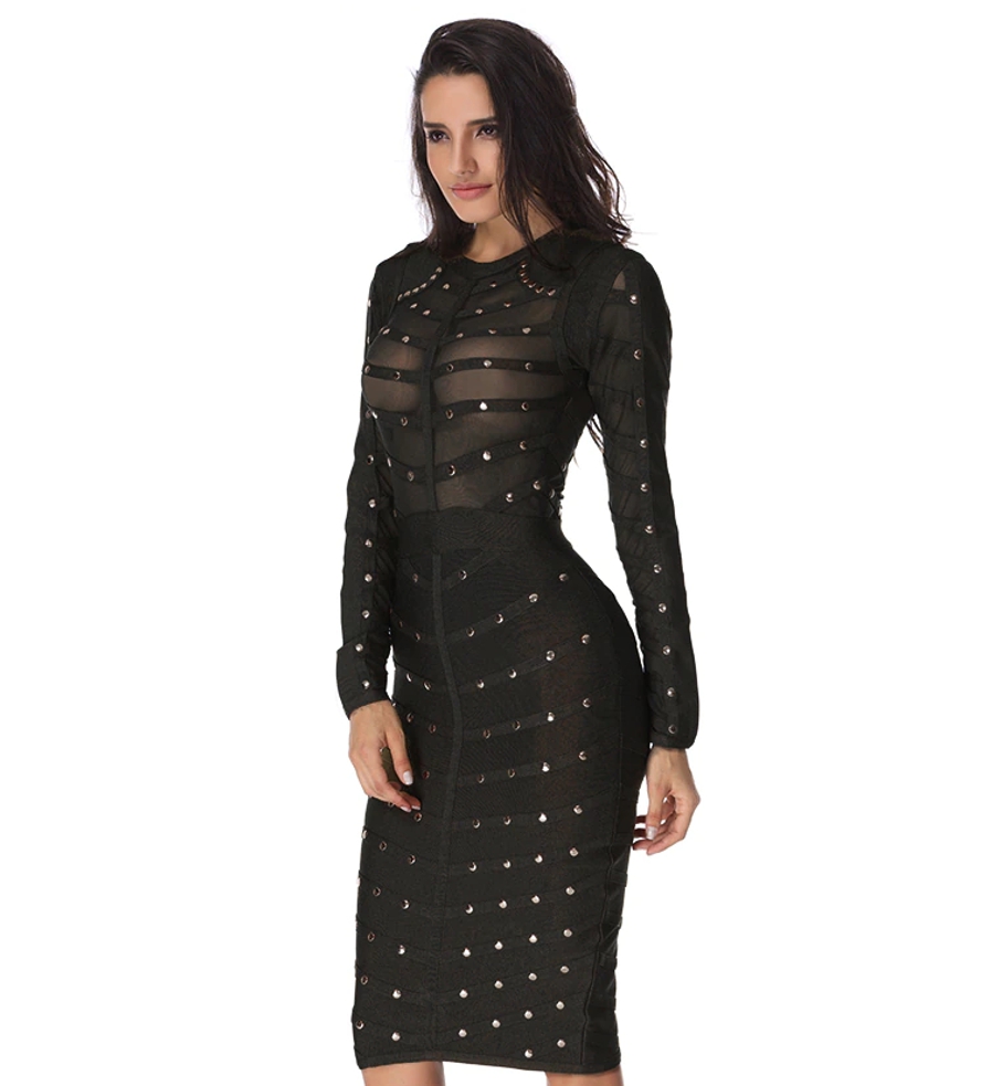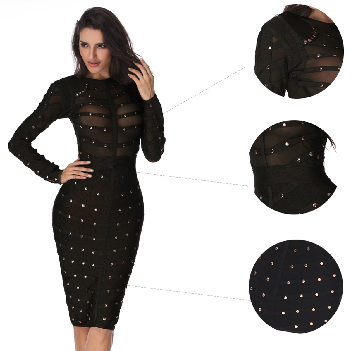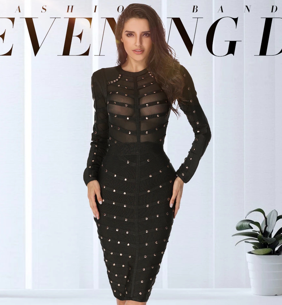 Hermoso y encantador vestido tipo Bandage con encaje y mangas largas, de exclusivo diseñador ideal para temperaturas cálidas, confeccionado de poliéster, malla y espándex. Acabado garantizado.