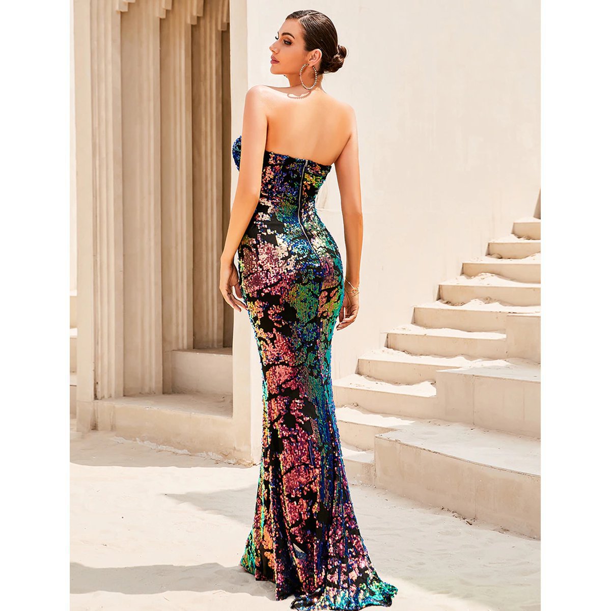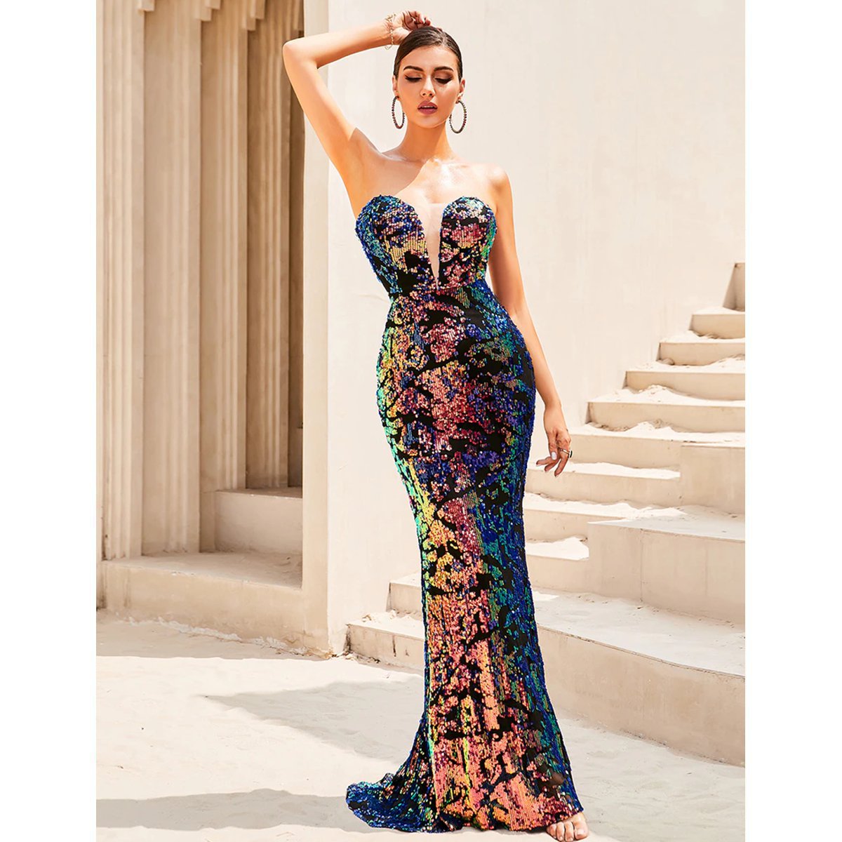 Impresionante vestido largo, de lujo, hecho de lentejuelas multicolores, altamente elegante, sin mangas y con lindo escote, ceñido al cuerpo, ideal para ocasiones especiales con un exclusivo diseño y acabado de primera garantizado.