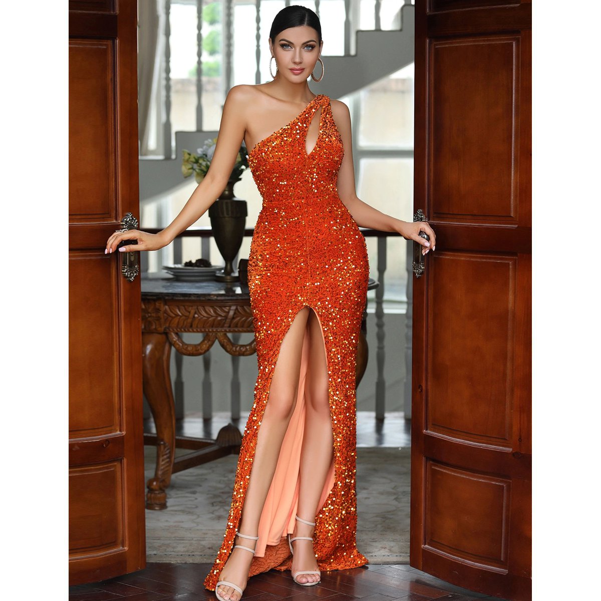 Maravilloso vestido largo, sujeto al hombro izquierdo, sin mangas, ideal para ocasiones especiales con un exclusivo diseño. Hecho íntegramente de lentejuelas con forro por dentro y acabado de primera garantizado.