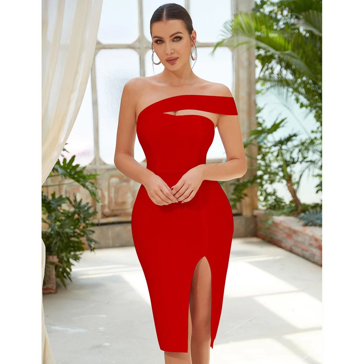 Encantador e impactante vestido tipo Bandage color rojo, sujeto a un hombro, sin mangas, con abertura hasta el muslo, ideal para sorprender e impactar. Confeccionado íntegramente de poliéster de alta calidad, moldea tu figura.