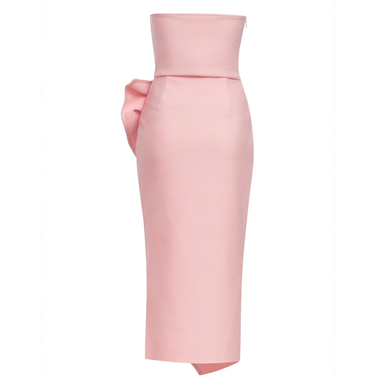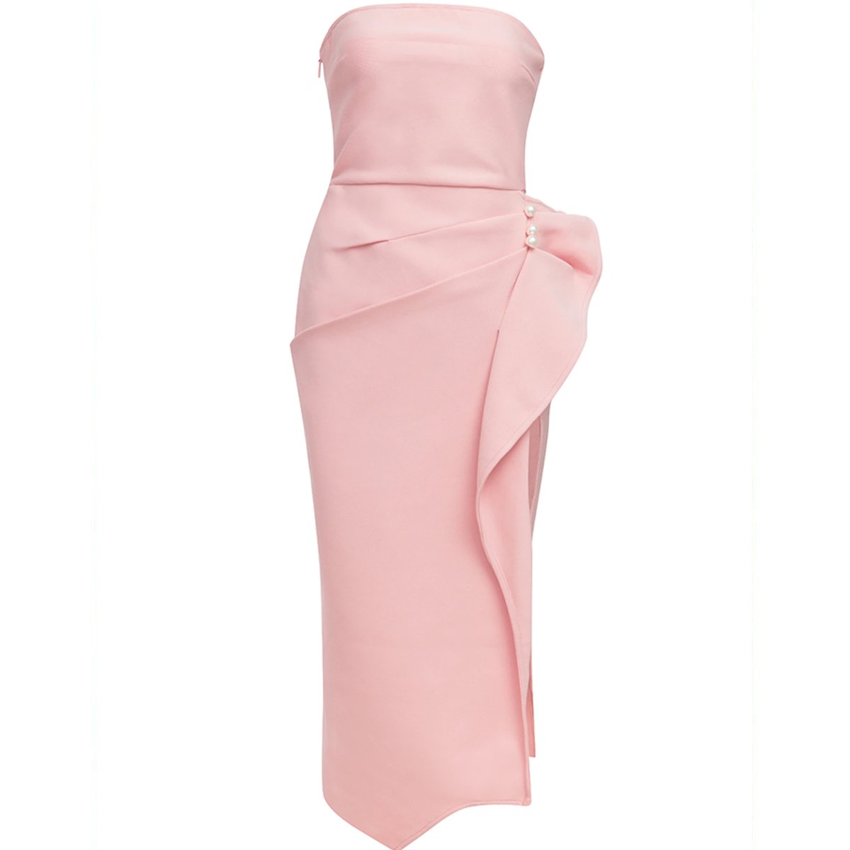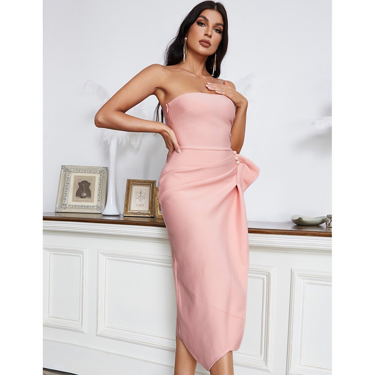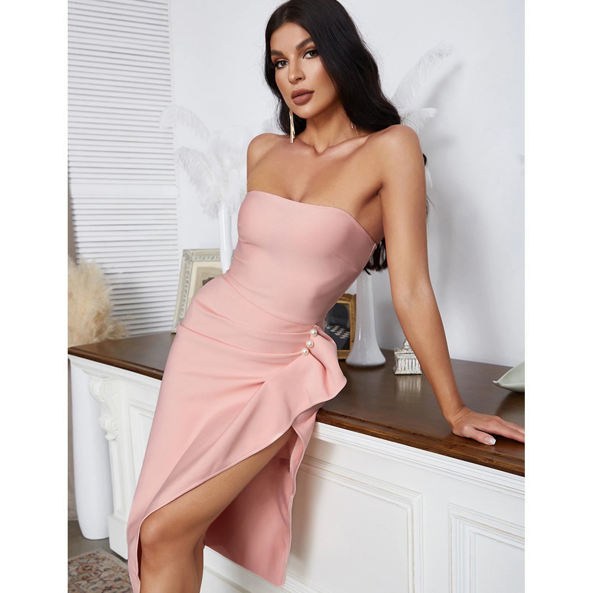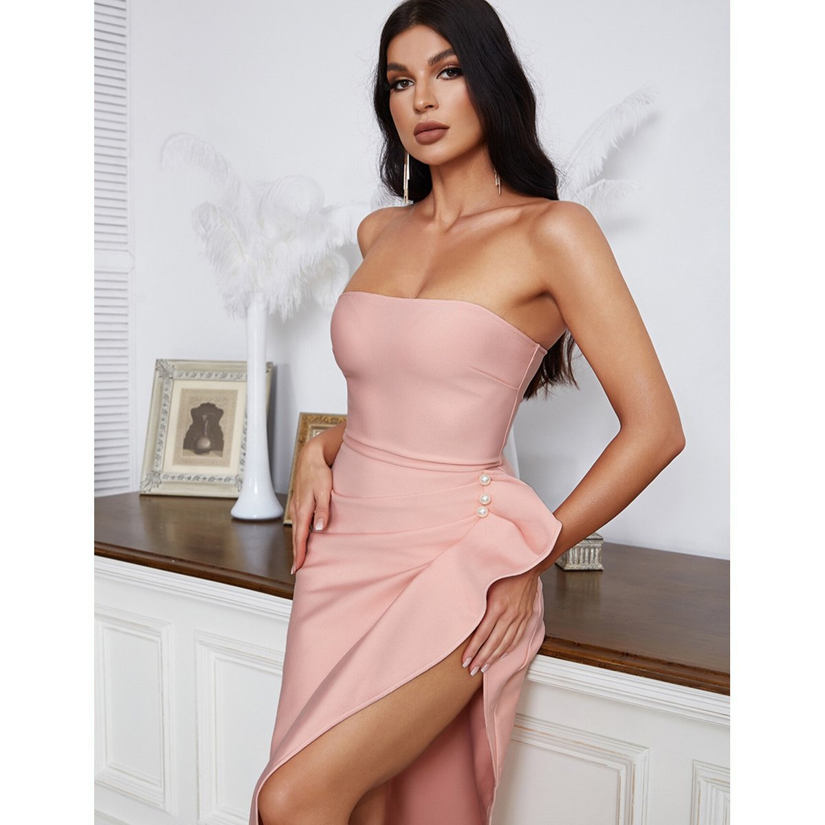 Hermoso y espectacular vestido sin tirantes, con hombros descubiertos, con volantes, muy sexy, con perlas a la altura de la cintura, fabricado con poliéster y spandex, ideal para una fiesta o evento especial.