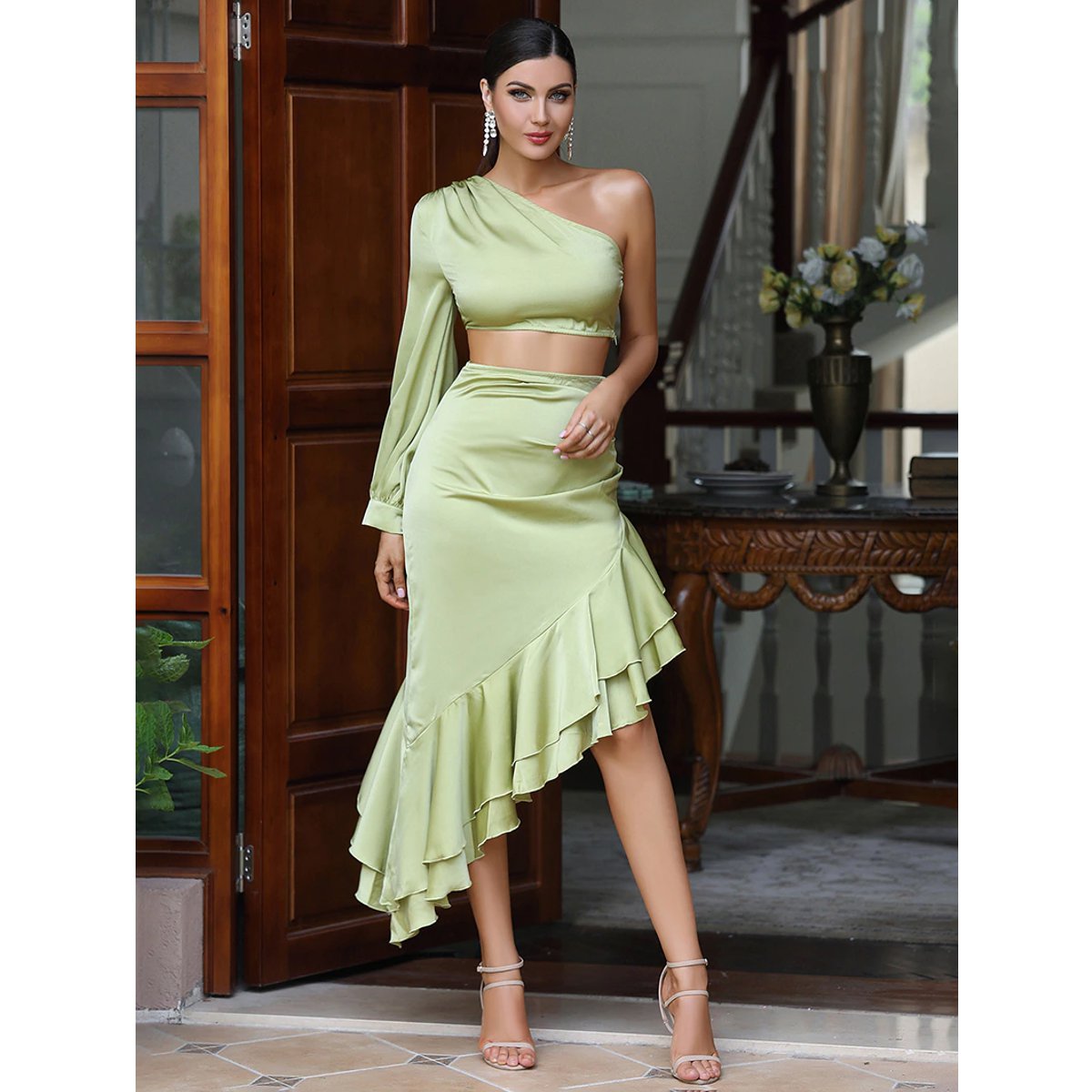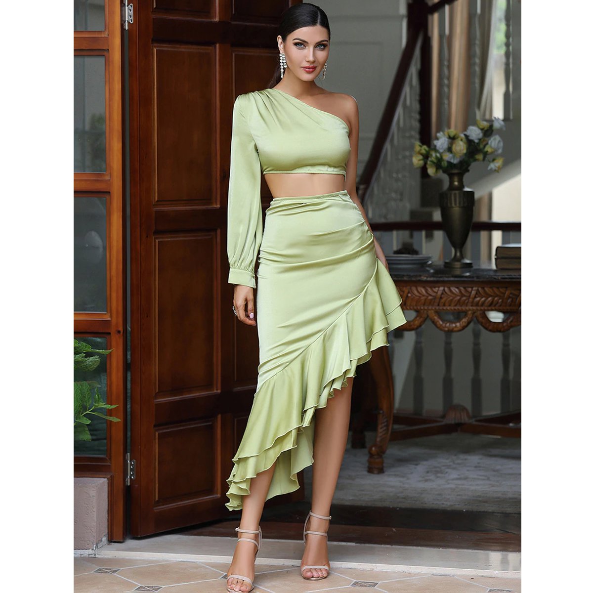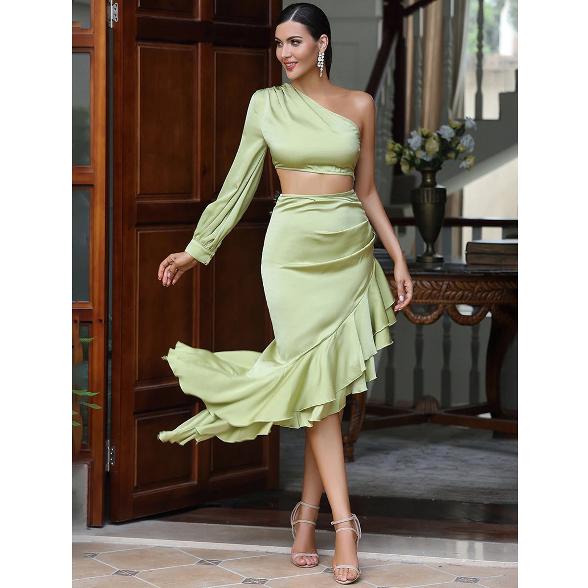 Encantador vestido largo color verde, con una manga y un hombro descubierto, y falda asimétrica, diseñado para fiesta, pasarela o celebridades, hecho íntegramente de poliéster.