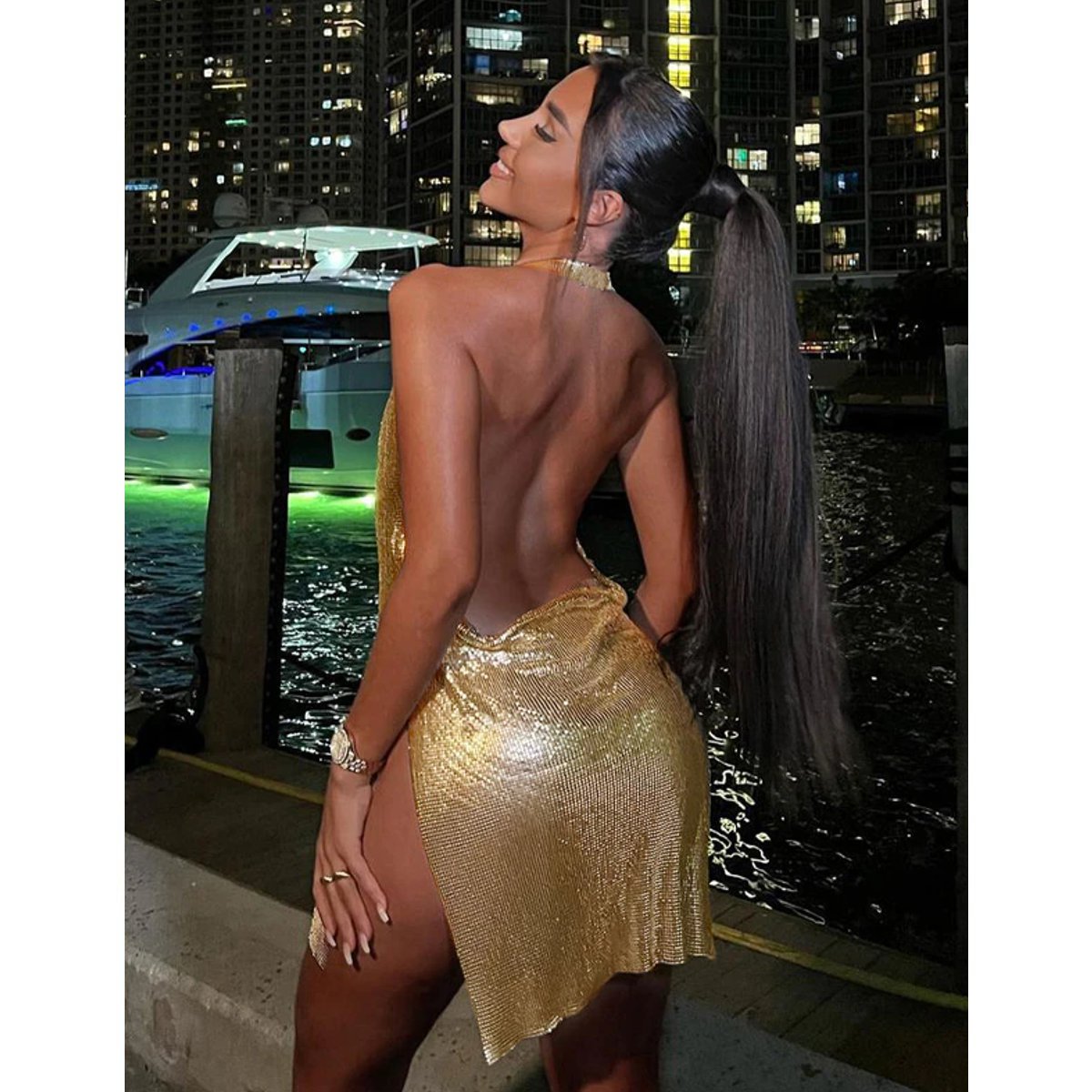 Hermoso y muy sexy mini vestido dorado, con cuello tipo halter hecho de poliéster y spandex, con muy buen acabado y exclusivo diseño, ideal para fiestas y eventos especiales, muy elegante.