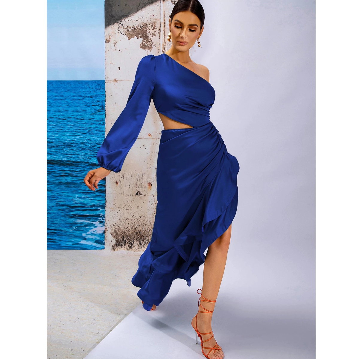 Espectacular vestido largo en color azul, con un un hombro descubierto, y abertura lateral, diseñado para fiesta, pasarela o celebridades, hecho íntegramente de poliéster.